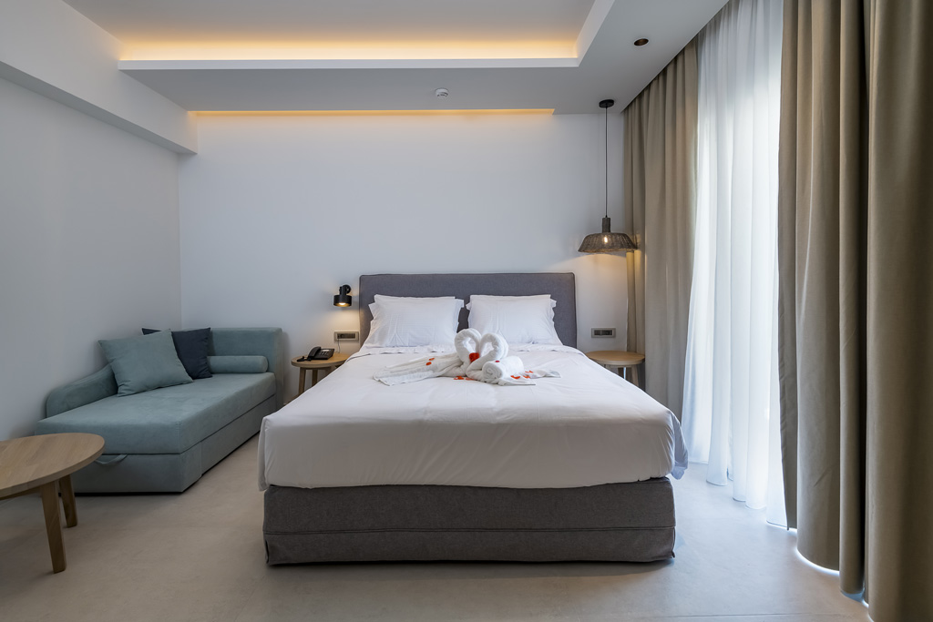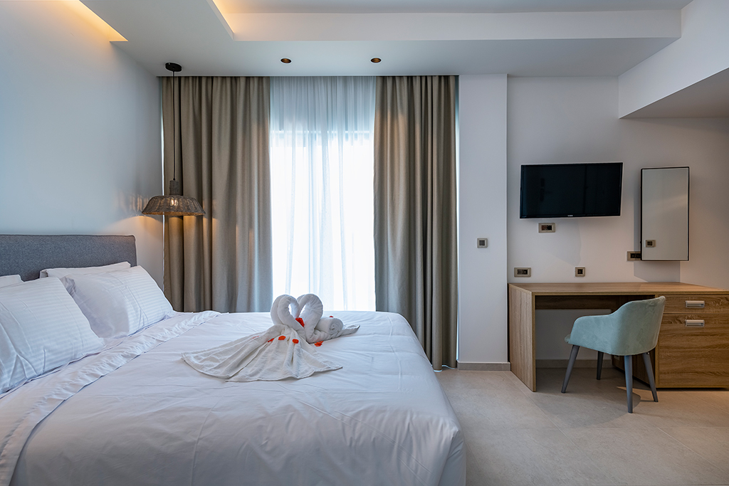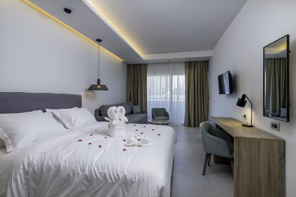 Our hotel consists of 28 Double Superior rooms and 51 Double Standard rooms surrounded by beautiful gardens, new design pools, a kid’s pool and a relaxing new snack-bar area, where you will enjoy a beverage and a snack while sunbathing on our comfortable sunbeds in the water or under the shade listening to lounge and international music.